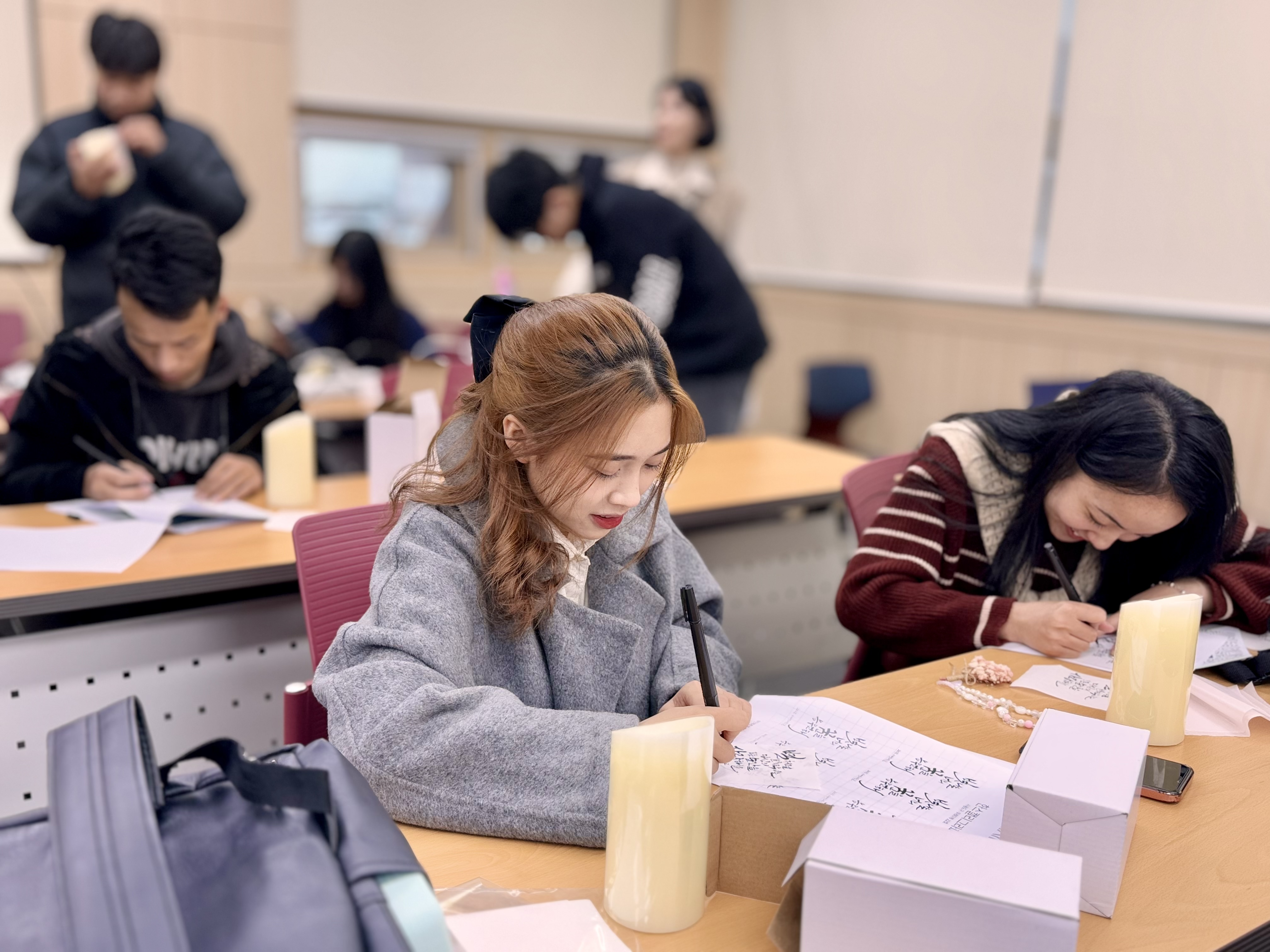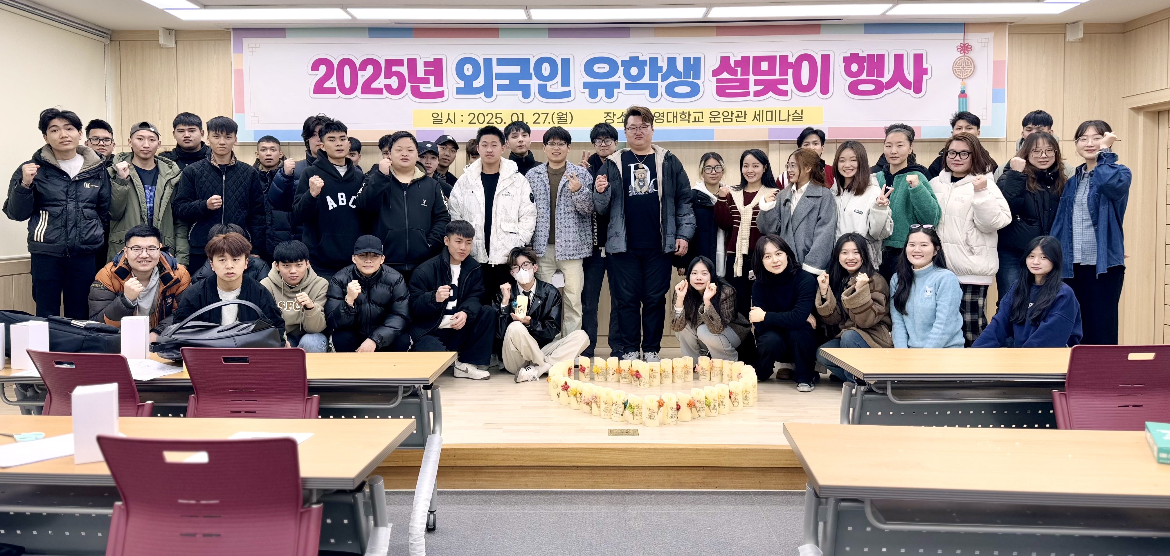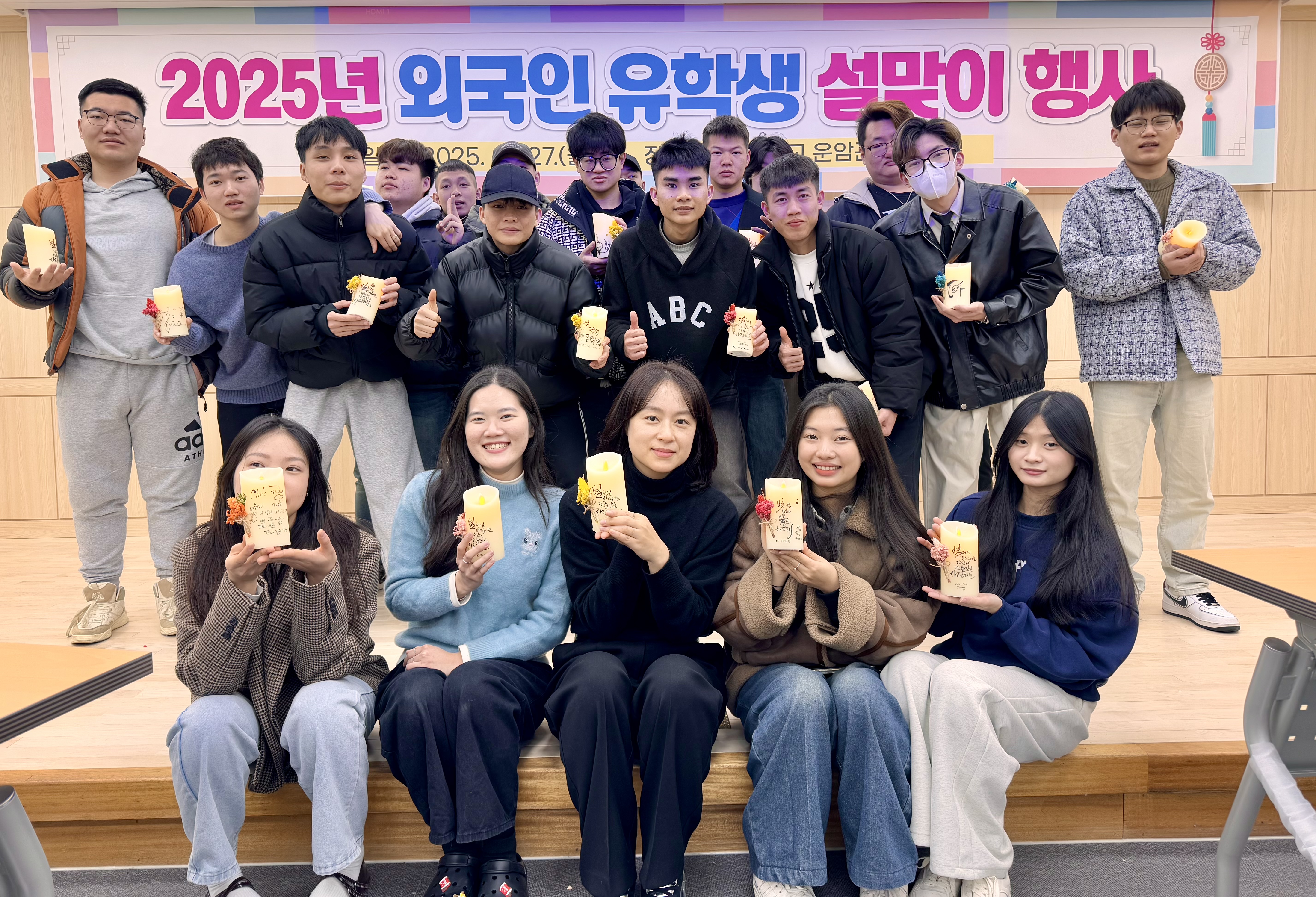 2025.01.27 유학생 설 맞이 행사를 진행하였습니다. 체험활동으로 한글 캘리그라피 led초 만들기와 자국의 전통음식을 서로 나눠먹었습니다.