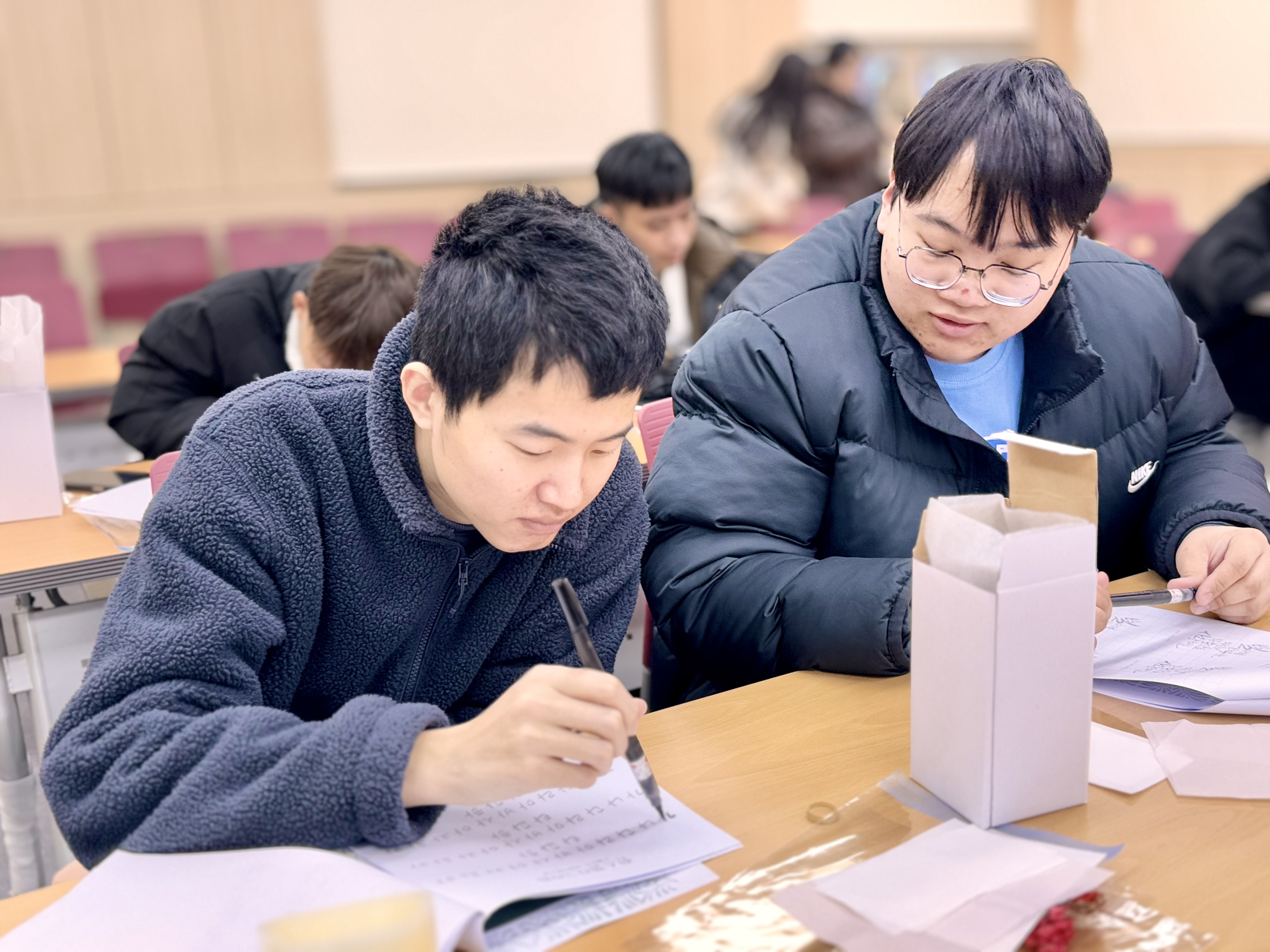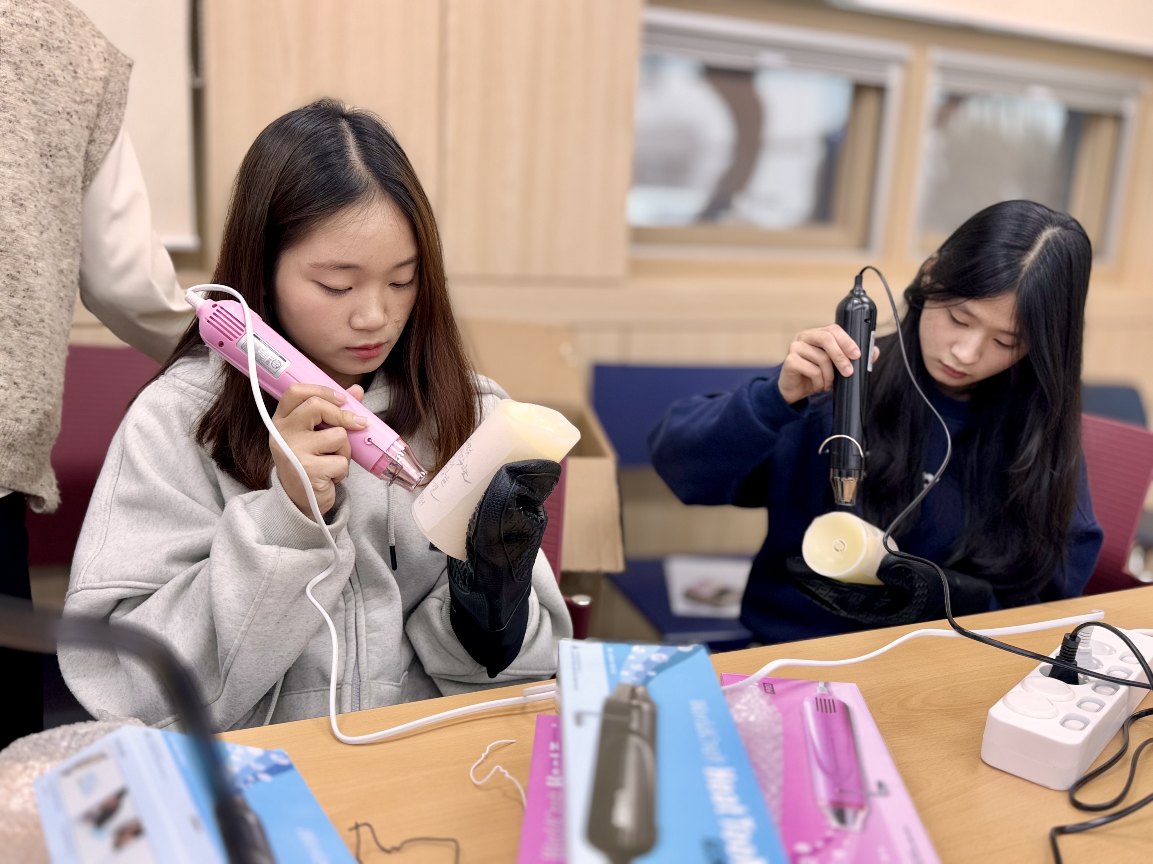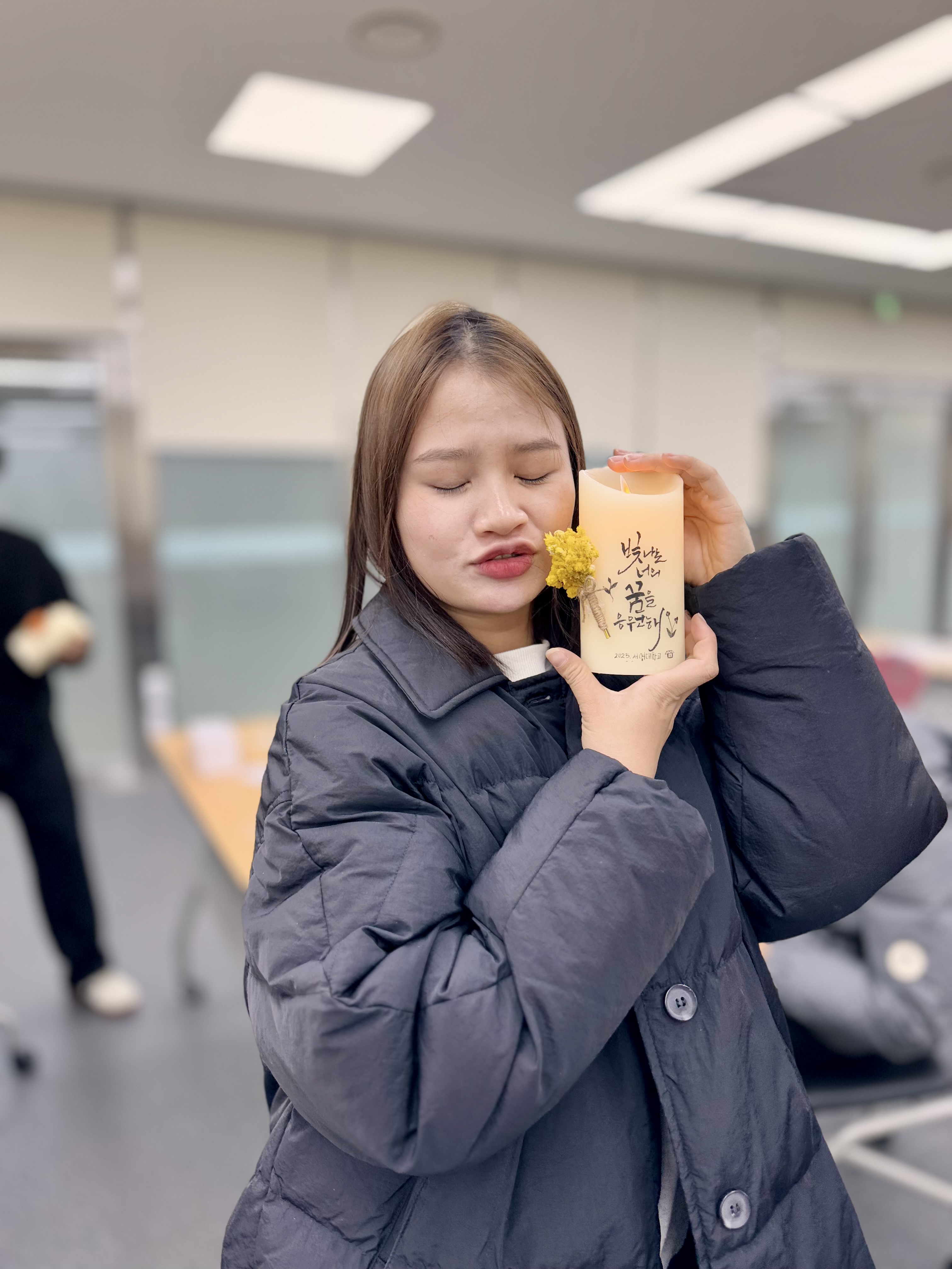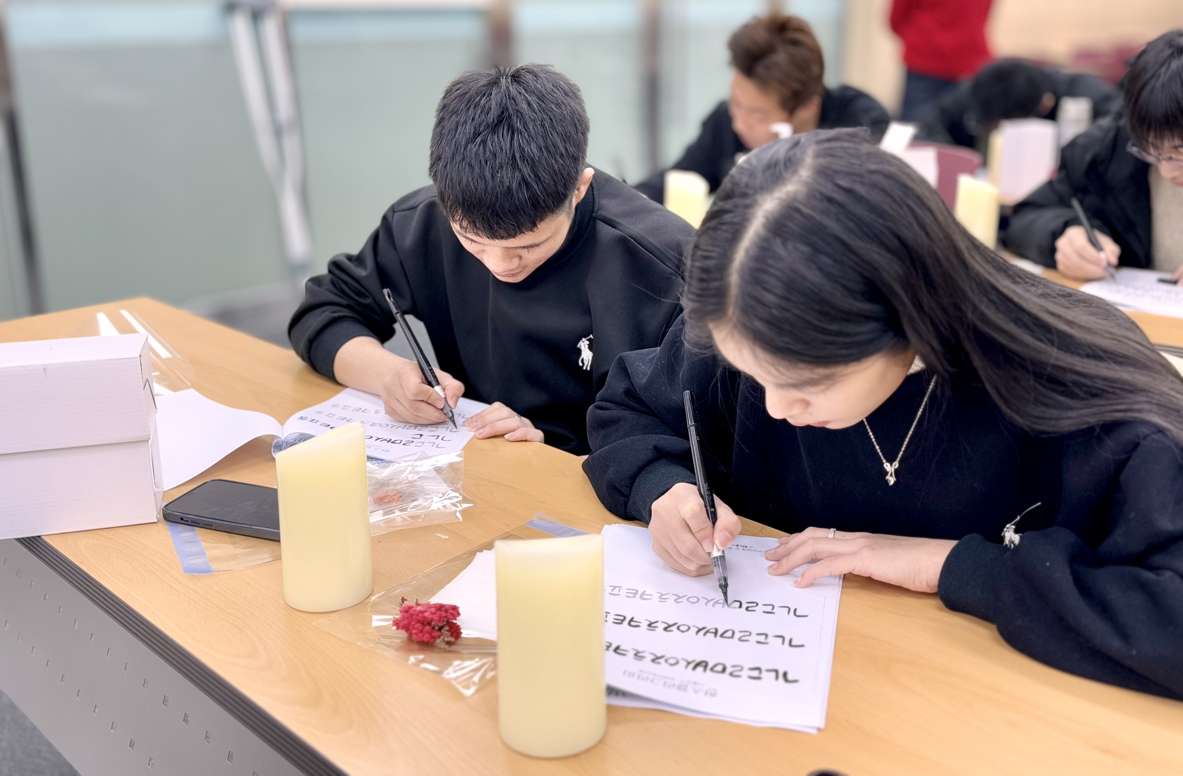 2025.01.27 유학생 설 맞이 행사를 진행하였습니다. 체험활동으로 한글 캘리그라피 led초 만들기와 자국의 전통음식을 서로 나눠먹었습니다.