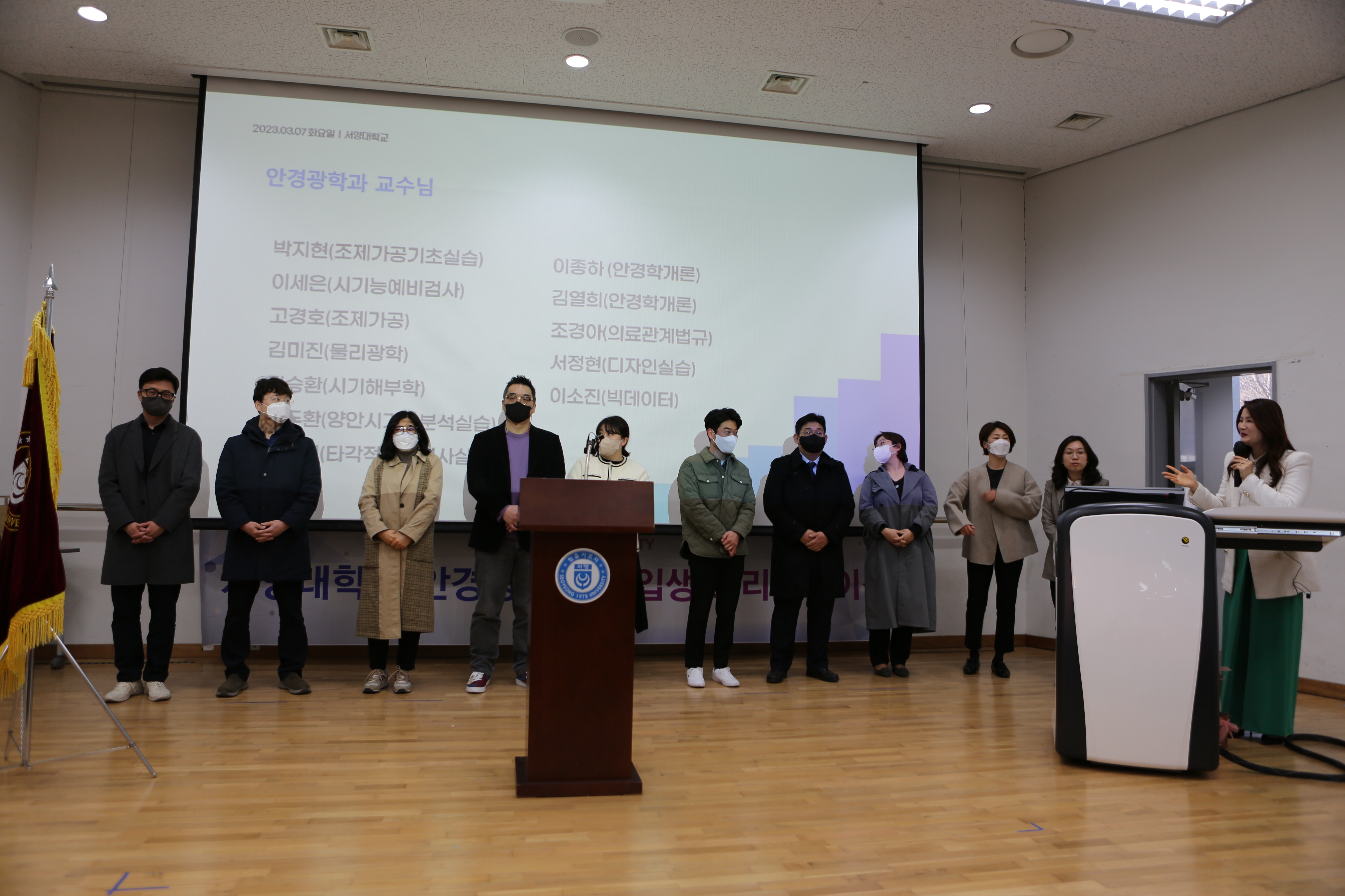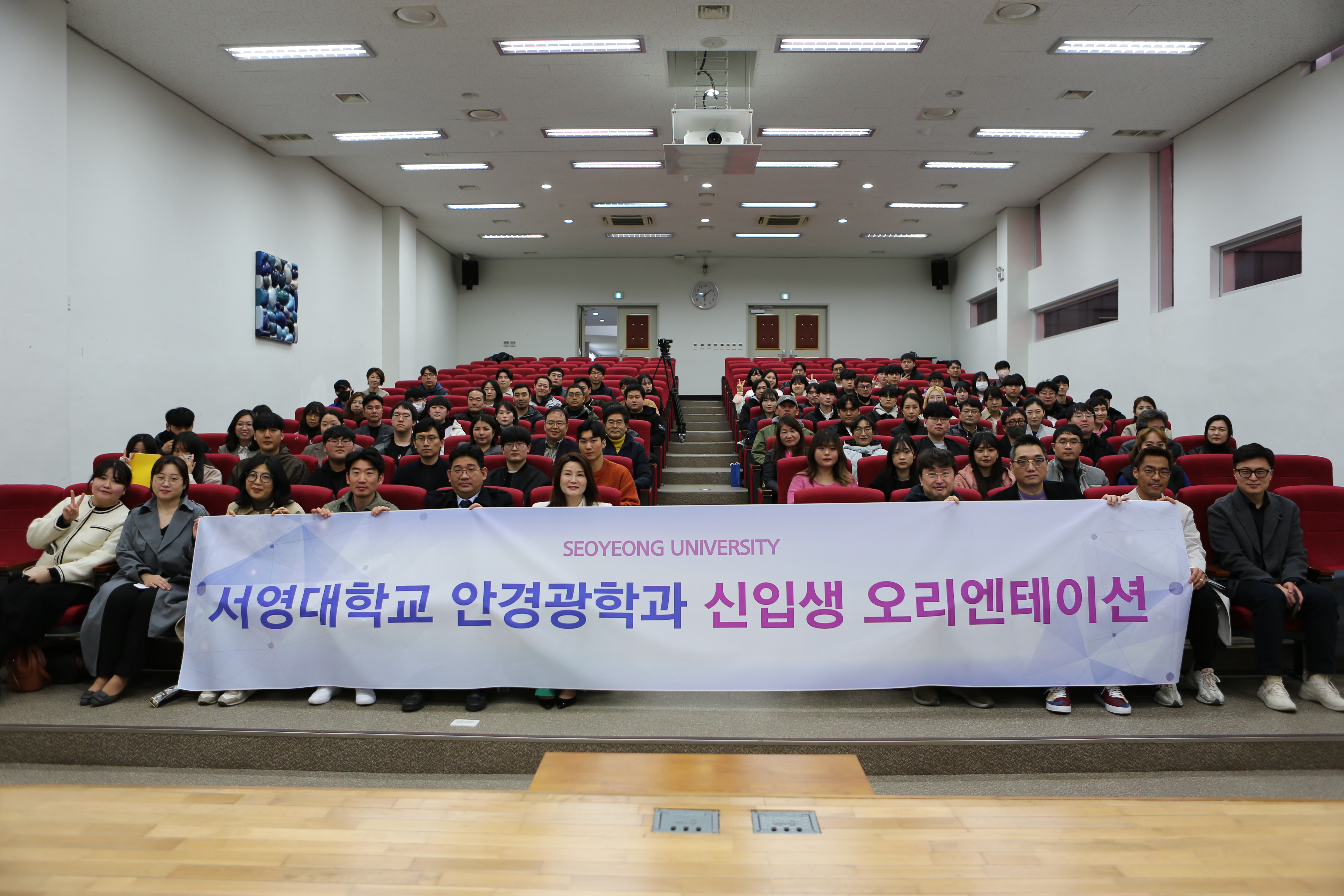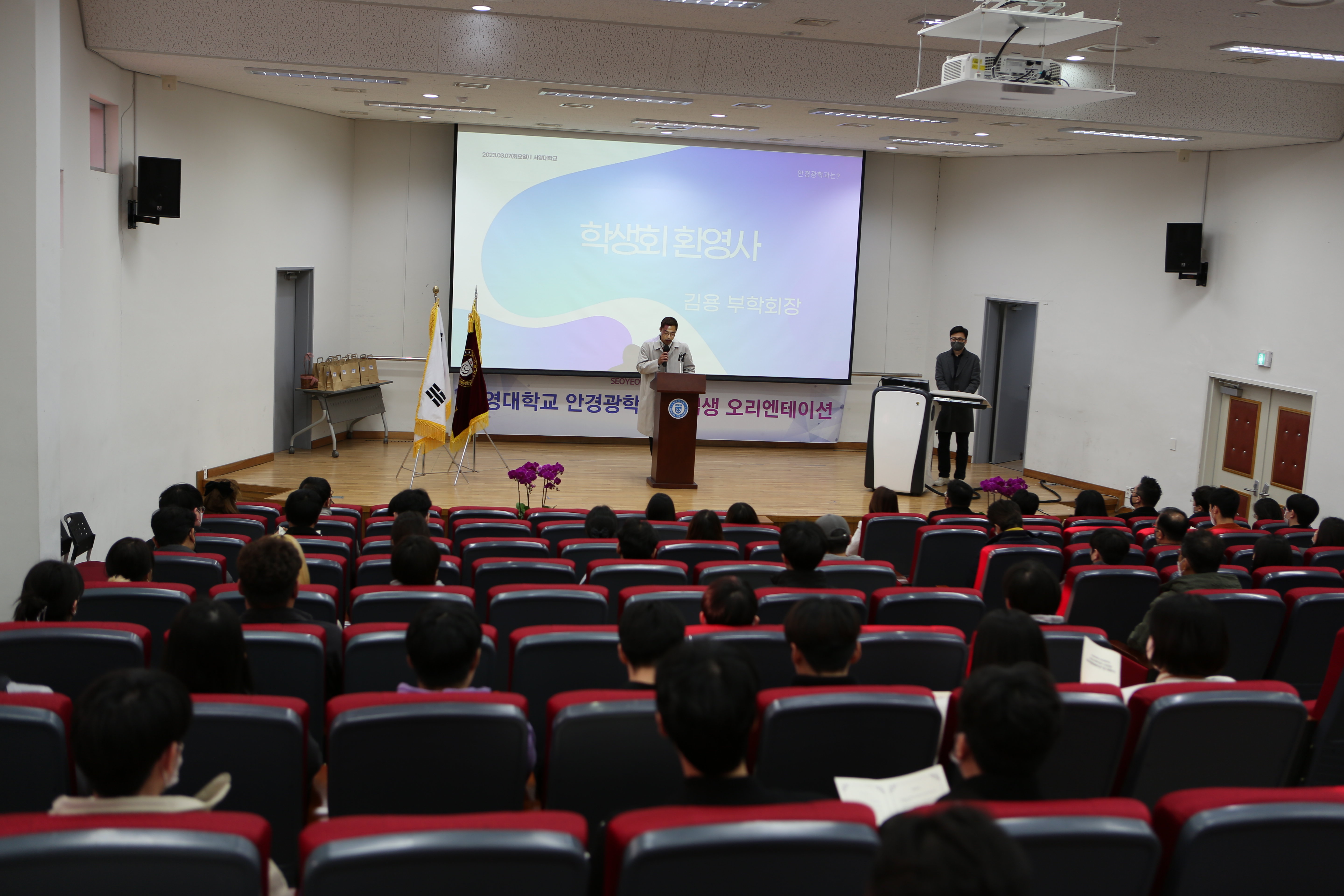 안경광학과 23학년도 신입생과 2,3학년 전체 재학생이 본 행사를 통해 처음으로 한 장소에 모이게 되었습니다.   행사사회는 이두환 교수님께서 진행해 주셨습니다. 학생회의 환영인사를 시작으로 행사가 시작되었고 학과장님께서 신입생들을 환영해 주시고,  대학생활에 대한 안내를 진행해 주셨습니다. 또한 서영대학교 안경광학과의 수업을 담당해주시는 교수님들께서 자리해 주셔서 함께 인사를 나눌 수 있는 시간이 되었습니다. 특별히 본 행사를 위해서 산업체에서 후원해 주셔서 많은 자리에 참석해 주신 분들을 위한 행운권 추첨 행사가 진행되어 참석하신 분들에게 선물을 드릴수 있었습니다.   마지막으로 3학년부터 1학년 까지 간단한 자기소개를 통해 서로 얼굴을 익힐수 있는 대면식 행사가 진행되었습니다.   본 행사를 준비한 안경광학과 학생회 여러분 및 많은 도움을 주신 재학생 여러분 모두 감사합니다.   무엇보다도 23학번이 되신 신입생 여러분 환영합니다.! 여러분의 새로운 출발을 서영대학교에서 응원하겠습니다.