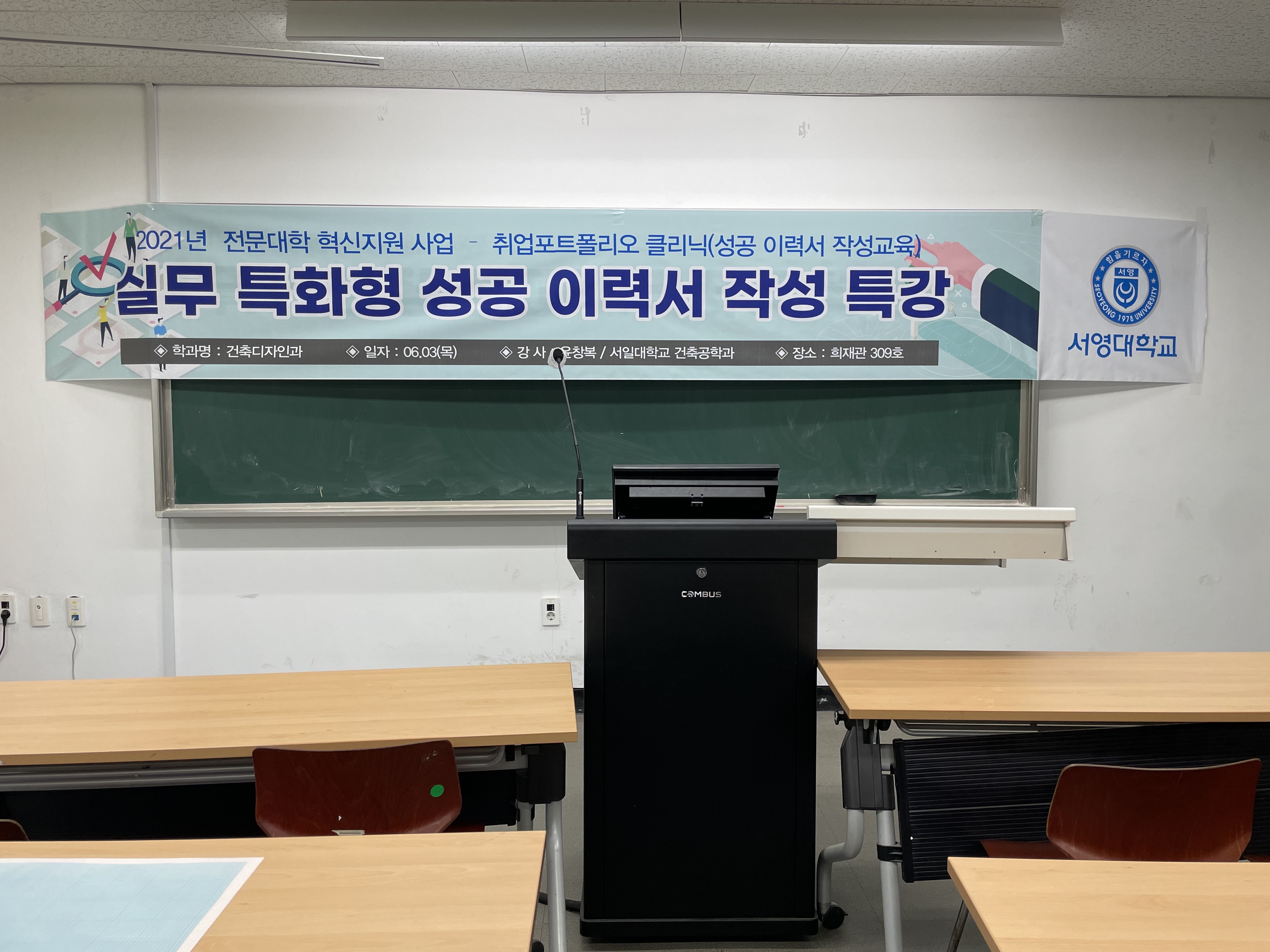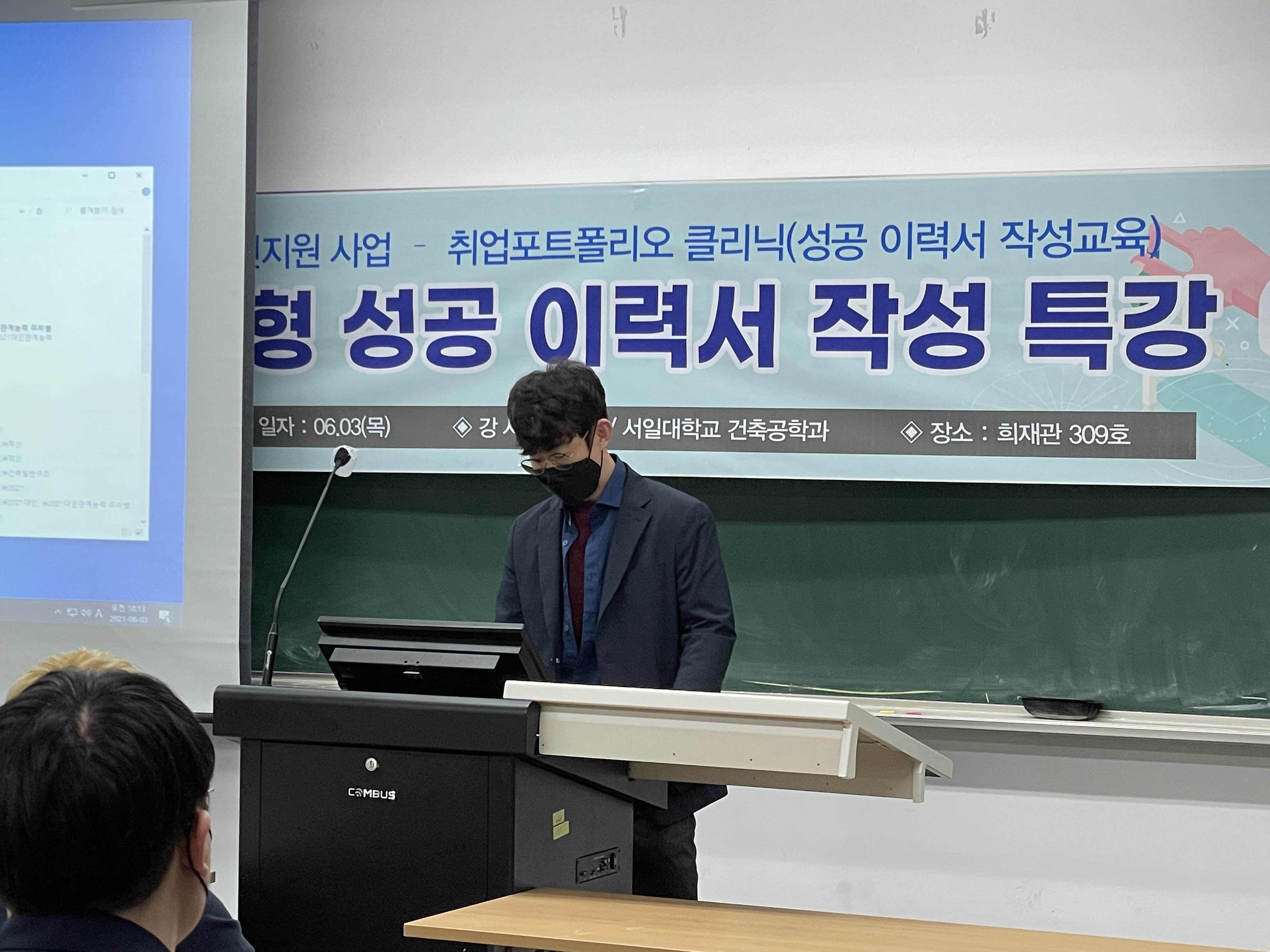 3학년들을 대상으로 성공적인 이력서를 작성하기 위한 특강이 희재관 309호에서 이뤄지고 있는 모습입니다.