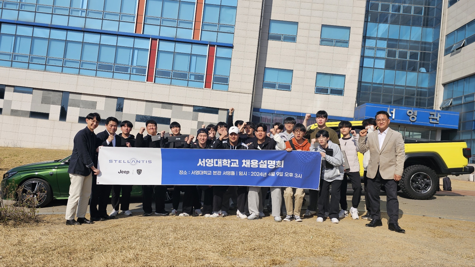 서영대학교 서영관 서영홀에서 진행된 신입사원 채용 설명회에 스텐란티스 코리아 윤O로 이사님참석, 인천, 일산, 서울 딜러사 인사팀 팀장님 참석하셨으며 서영대학교 미래자동차과 재학생 60여명이 참석하여 채용준비에 대한 많은 질의로 뜨거운 채용설명회가 되었고, 특히 채용설명회 이후 스텔란티스 대표 브랜드 지프와 푸조 차량을 시승해 보는 시간을 가져 재학생들의 많은 관심과 호응을 받았다.