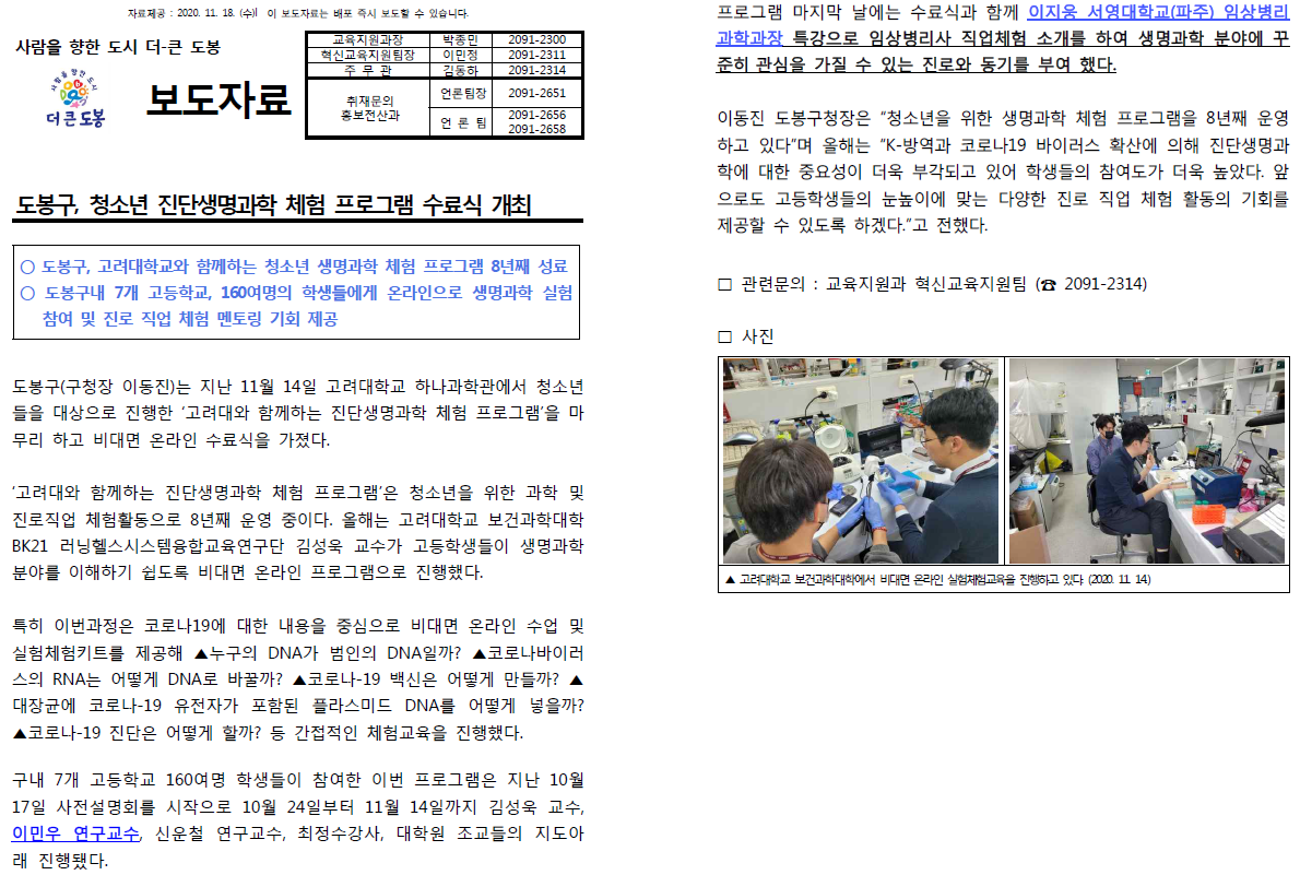 최근 서영대학교(파주캠퍼스) 임상병리과 이지웅 학과장은 주말임에도 불구하고, 고려대학교와 함께하는 서울시 도봉구 소재 고등학생들을 대상으로 하는 "2020 청소년 진단생명과학 체험" 비대면 프로그램에 초청되어 고등학생들의 진로 결정에 도움이 되도록 "임상병리사란?" 주제로 임상병리사의 전반적인 사항에 대해 특강을 하고, 또한 서영대학교 파주캠퍼스 임상병리과 입시 홍보를 동시에 진행하였다.