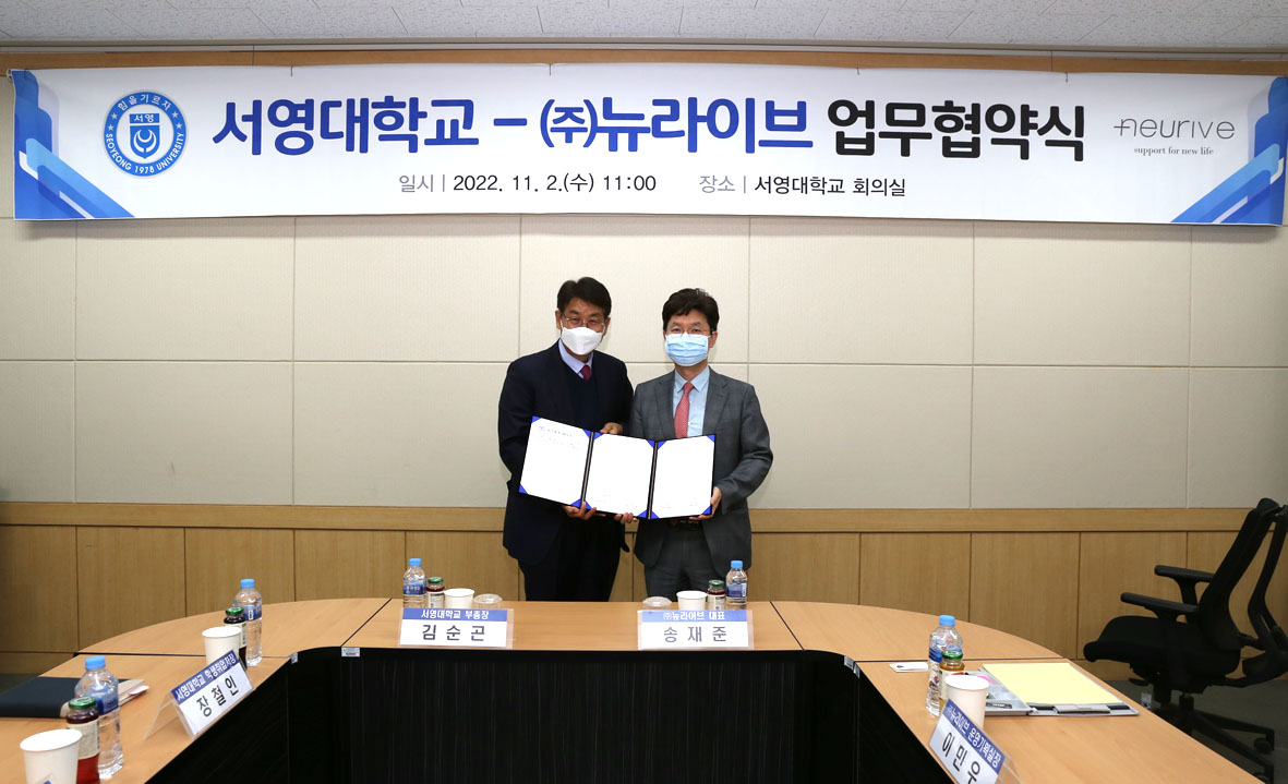 O. 우리대학(총장 김정수)는 2일(수) 서영대학교 회의실에서 고려구로병원 자회사인 ㈜뉴라이브(대표이사 송재준, 고대구로병원 이비인후과 교수)“서영대학교(파주) 임상병리학과와 함께 비침습적 미주신경자극(VNS) 기술을 활용한 전자약의 공동연구 및 보건계열 학생 취업”에 관한 업무협약을 체결했다.