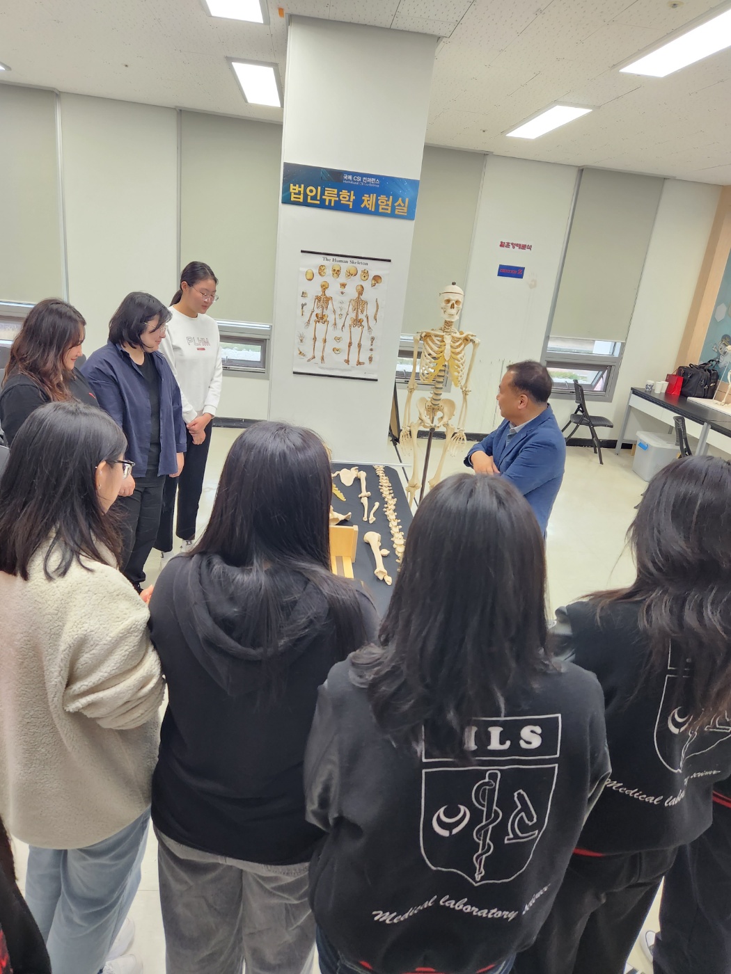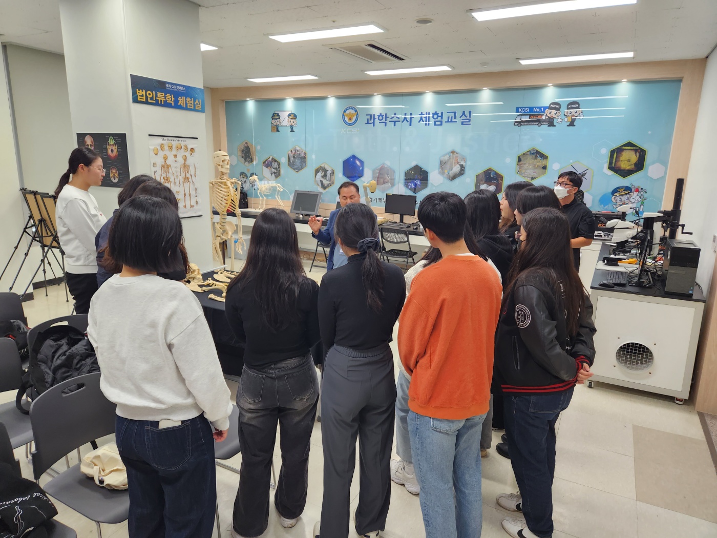 과학 수사 체험교실에서 법인류학 개요, 혈흔형태분석, 지문감정, DNA분석, 법최면· 몽타주, 프로파일링, 문서감정, 폴리그래프 등의 분야에 대한 다양한 수사기법 교육 및 실습이 2시간 가량 진행되었다. 이 날 교육을 위해 경기북부경찰청 과학수사팀에 재직 중인 김영삼 팀장님이 수고해주셨다.