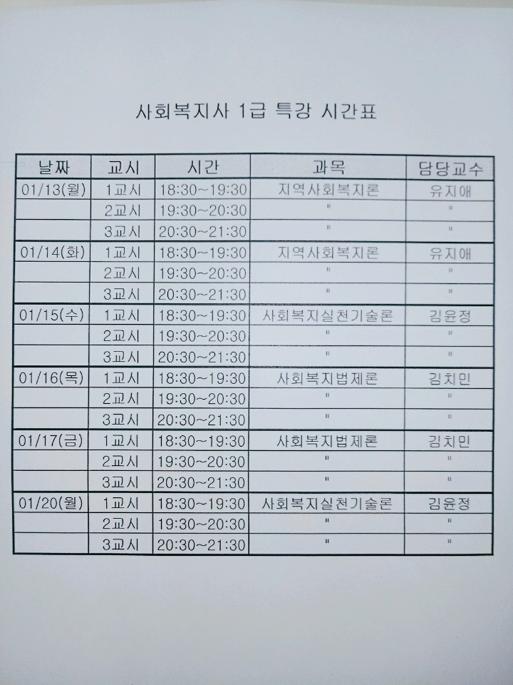사회복지행정과에서는 2020년 1월 13일부터 2020년 1월 20일까지 파주시 고용복지플러스센터에서 사회복지사 1급 시험 대비 특강을 진행하였습니다.