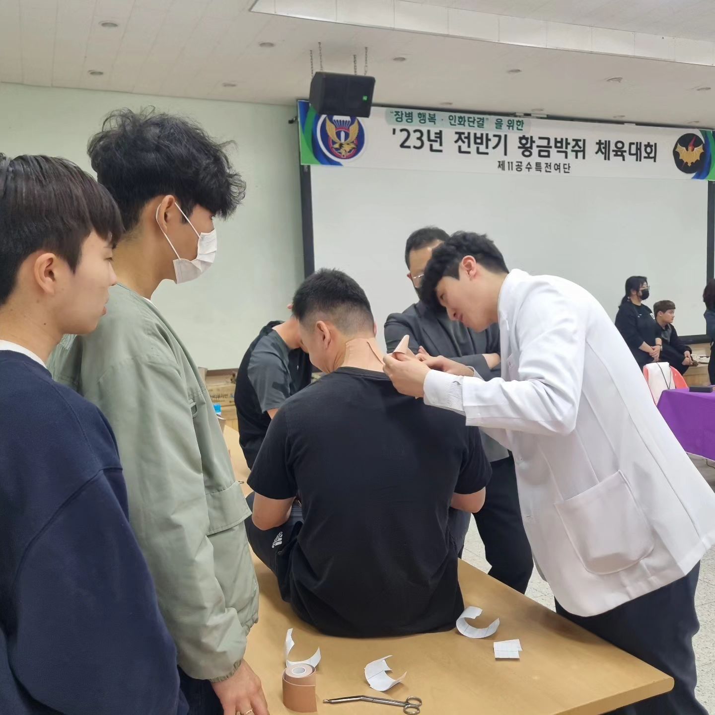 나라를 위해 헌신하고 계시는 특전사분들에게 근골격계 질환 부상예방을 위한 테이핑을 시행하였고, 각자 몸 상태에 맞는 맞춤 스트레칭 방법과 건강관리 방법 등을 교육하고 지원하였습니다.